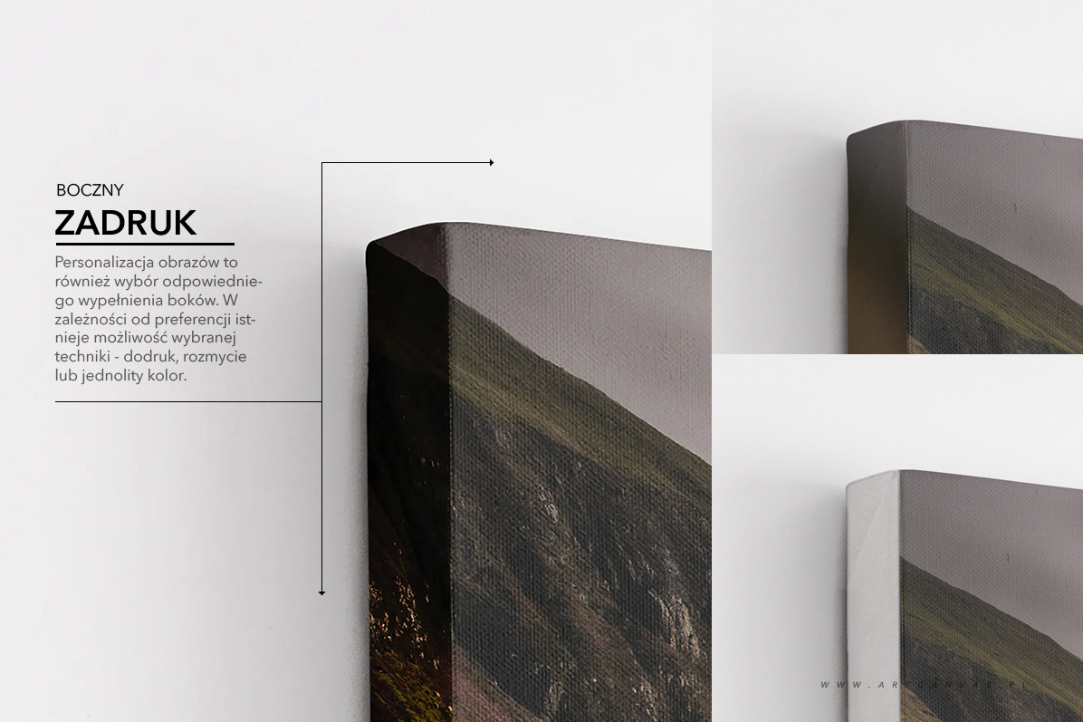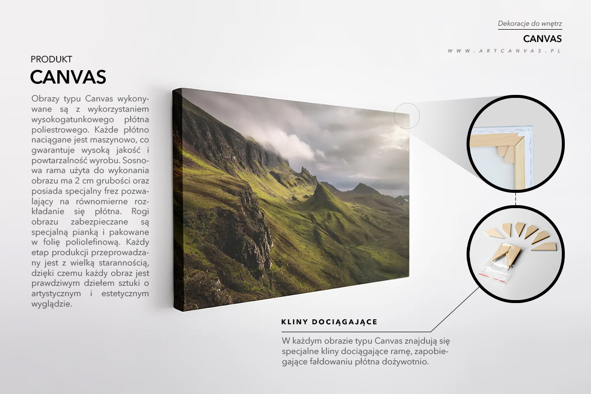 Obrazy wykonywane są z wykorzystaniem wysokogatunkowego płótna Canvas. Każde płótno naciągane jest na sosnową ramę o grubości 2 cm, pozyskaną z ekologicznych i odpowiedzialnych źródeł. Mnogość wzorów i motywów pozwala precyzyjnie dopasować obraz do stylu i aranżacji wnętrza. Ich struktura nadaje unikalny i realistyczny charakter kompozycji. Każdy etap produkcji przeprowadzany jest z wielką starannością, dzięki czemu każdy obraz jest prawdziwym dziełem sztuki o artystycznym i estetycznym wyglądzie.
